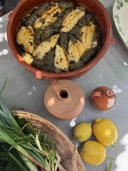 → To finish add in another generous drizzle of quality extra virgin olive oil and the stock. Finish by covering the dish with the remaining vine leaves.